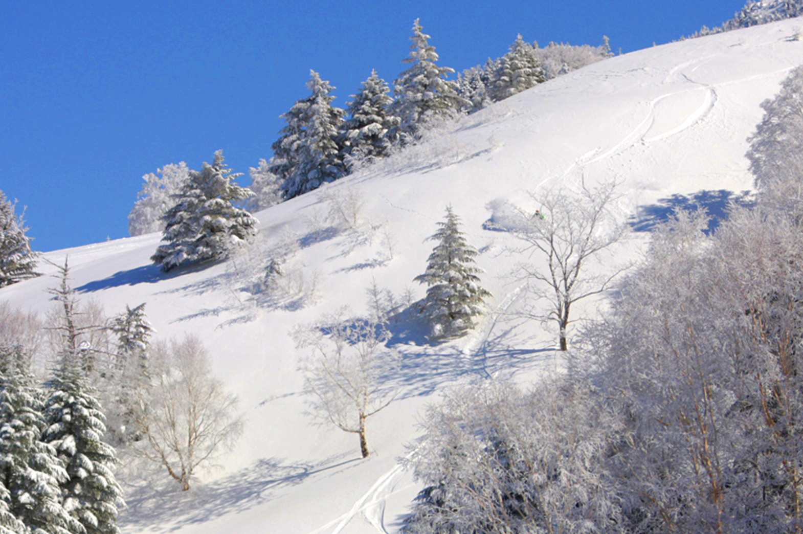 標高1,500M以上の牧場を利用したゲレンデは、自然の地形をそのまま活かし初級者からエキスパートまでそれぞれが楽しめます。 また、標高1,750mの山田牧場スキー場から標高950mの山田温泉スキー場まで標高差800mを滑り降りるタコチコース は、オフピステを走り抜ける全長13キロメートルのビッグなスケールのコースです。これだけの距離が最後まで滑れるコースは日本でもここだけ。目の前に広がる雄大な北アルプスや自然が生み出す芸術樹氷を眺めながらのスキーはまさしく感動の一言に尽きます。加えて野生のカモシカに出会うこともしばしば・・・。大自然の息吹が感じられるこのコースは、ゆったりと冬の贅沢な時間を過ごすには絶好のロケーションにあるコースです。